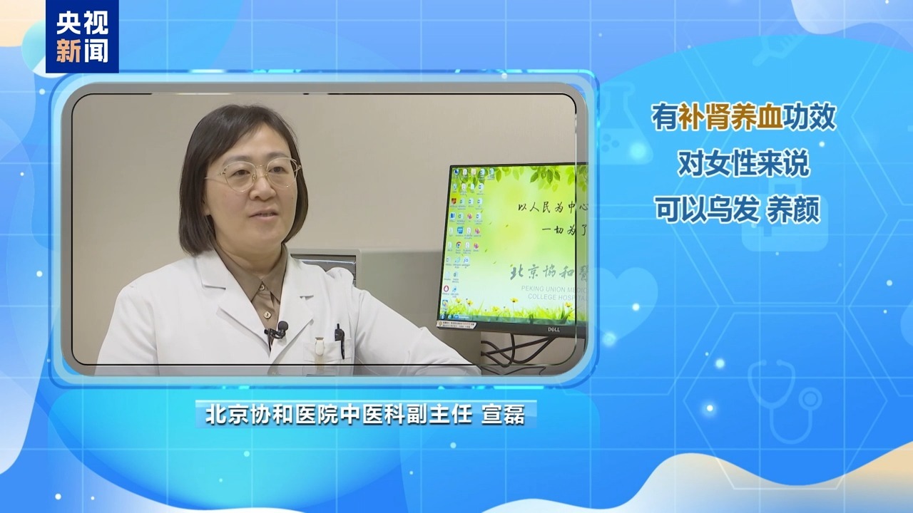 北京协和医院中医科副主任 宣磊:比如说,在家可以准备50克的黑豆,30克的黑芝麻,20克的黑米或者是紫米,再搭配10克的碎核桃和家里的红枣,用搅拌机把食物加一些水搅碎,变成浓浆,然后把浓浆再适当添一些水以后加热煮开。如果在没有糖尿病禁忌的情况下,也可以再适当加一些冰糖,这样就制成了一款适合冬季补肾补虚的一个药膳。它的功效可以补肾养血,对女性来说还可以乌发和养颜,也更适合日常比较容易掉头发或头发比较干枯、容易断裂的情况。