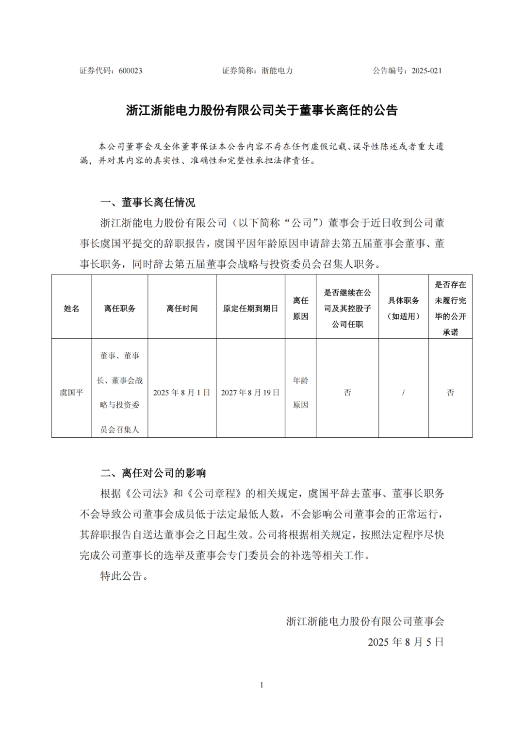 8月4日,浙能电力发布公告,董事长虞国平因年龄原因申请辞去第五届董事会董事及董事长职务,离任时间为2025年8月1日,原定任期到期日为2027年8月19日。虞国平同时辞去第五届董事会战略与投资委员会召集人职务,离任后不再在公司及其控股子公司任职。