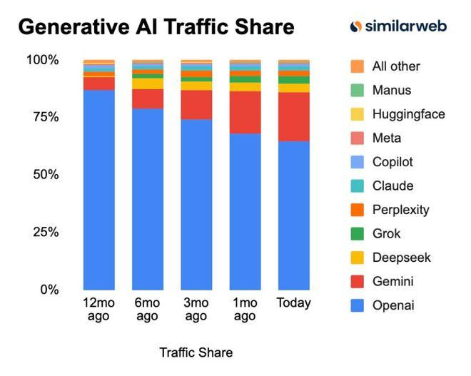 这套打法并不罕见,因为谷歌也是这么干的。根据Similarweb最新发布的《2026年全球AI追踪报告》,曾经独占鳌头的ChatGPT,市场份额从一年前的86.7%下降到64.5%;而Gemini的市场份额从5.7%增长到21.5%,成为其最强劲的竞争对手。