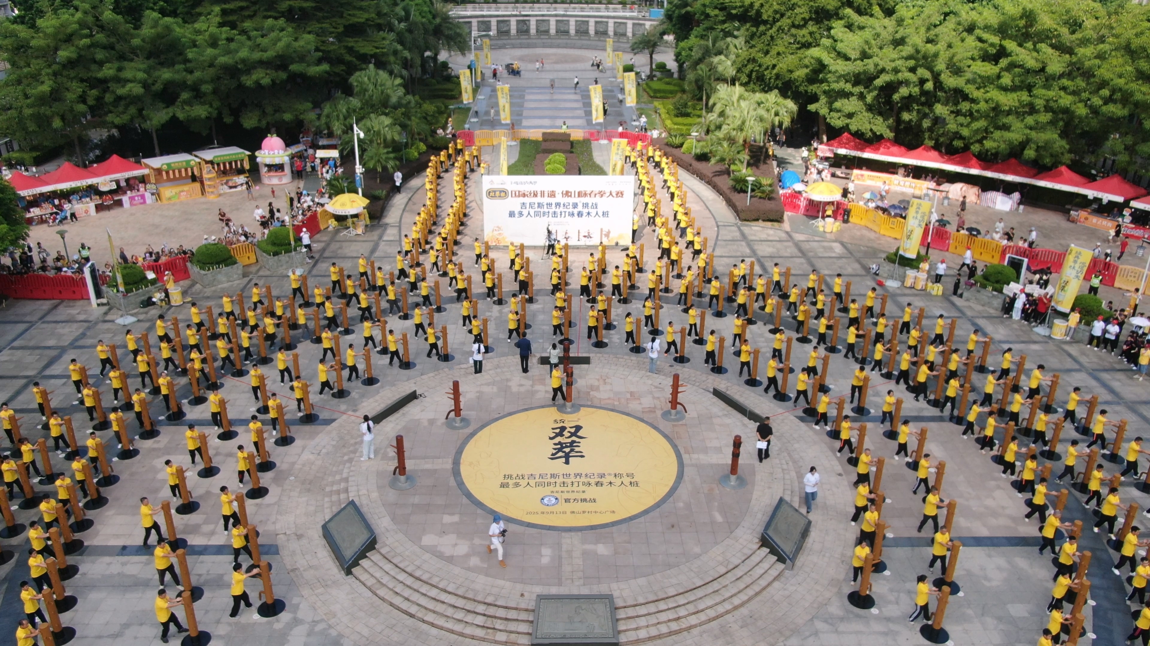 在南海,264名挑战者成功刷新“最多人同时击打咏春木人桩”吉尼斯世界纪录。