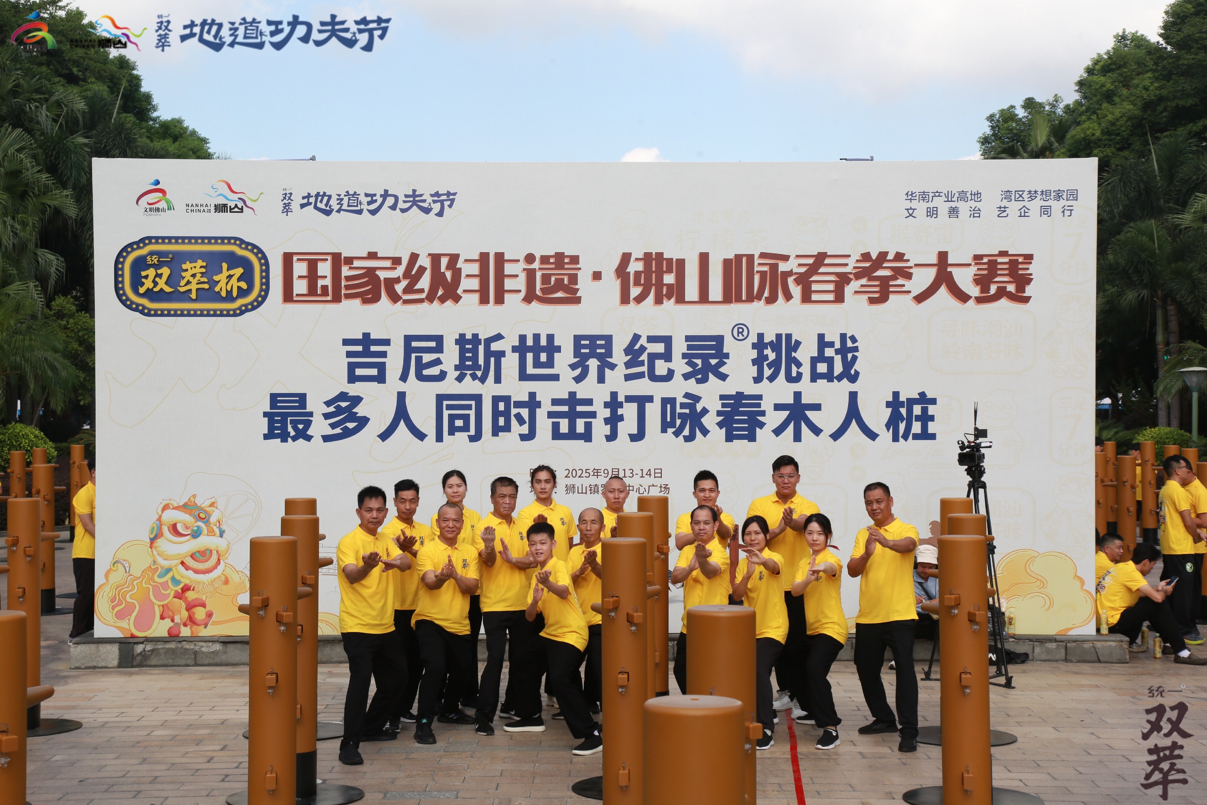 同样在狮山罗村中心广场,早于2010年,3167名咏春爱好者在此同打咏春拳,首破世界纪录。2024年,“最多人同时单腿下蹲”纪录再度花落狮山。如今,木人桩击打纪录的诞生,成为狮山以创新形式推动非遗“活起来”的又一里程碑。