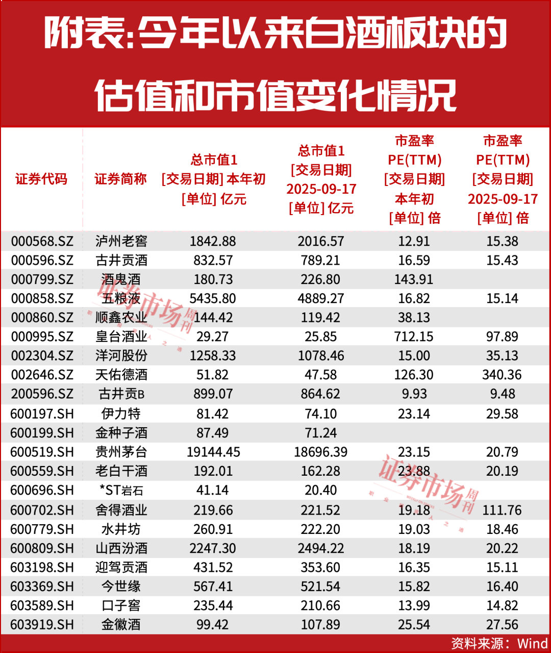 截至9月17日收盘,A股21家白酒上市公司总市值合计为3.32万亿元,相较于今年年初的3.43万亿元下降3.2%,其中16只白酒股市值出现下滑。在21家酒企中,有18家酒企的市盈率在40倍以内,贵州茅台和五粮液的市盈率分别为21倍和15倍。相较于其他板块,白酒板块当前处在低估值状态。